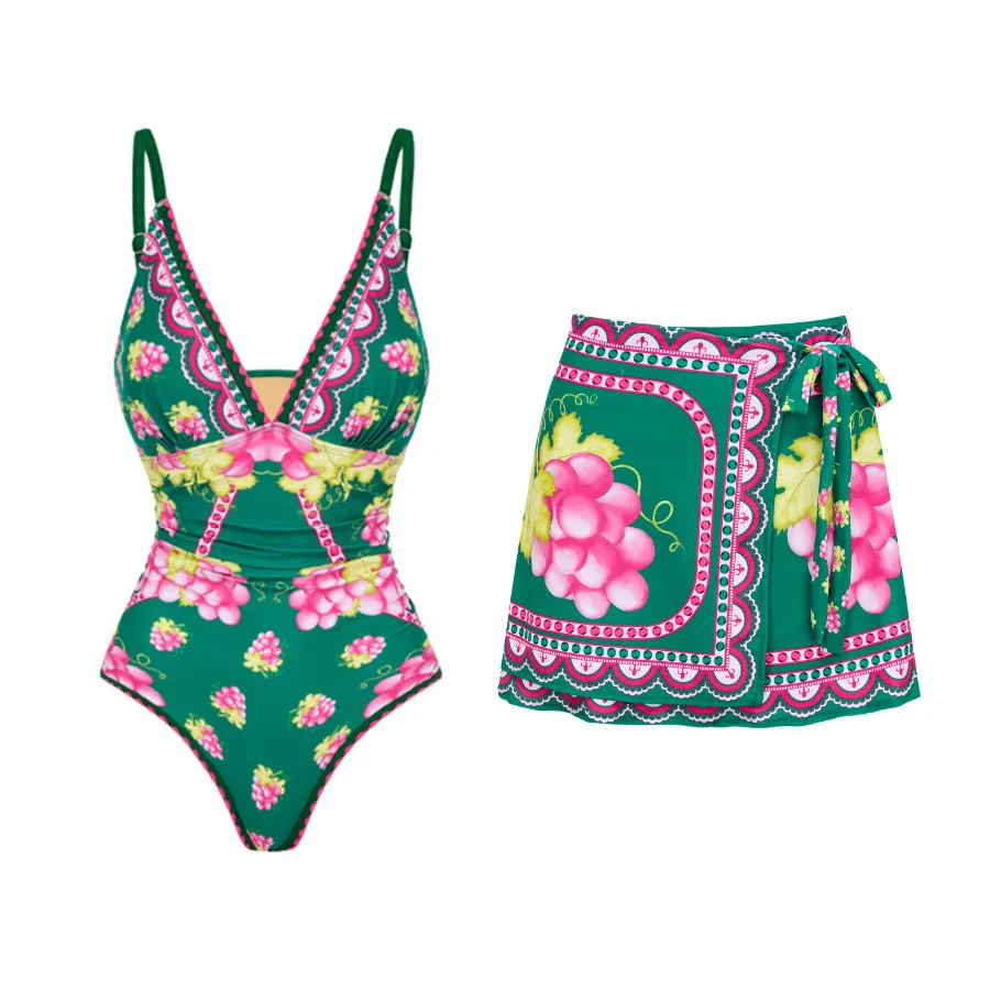 2024 Women Swimwear 2PC Cover-up Swimsuit Ruffle Dongbei Printed Deep V One-piece Monokini Kimono Bikini Suit Summer Beachwear